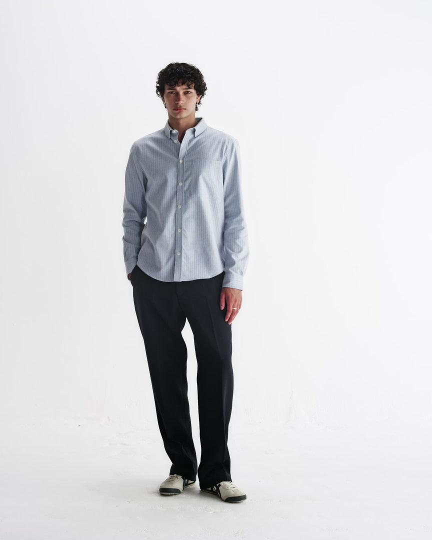 プレッピースタイルとモダンなワックスツイストを融合させました。リラックスフィットのカットで、ストライプ柄が美しい長袖シャツです。起毛加工を施したリサイクルポリエステルとコットンの混紡素材を使用し、柔らかく快適な着心地を実現。ボタンダウンカラーで、片胸パッチポケット、クラシックなボタンカフスが特徴です。