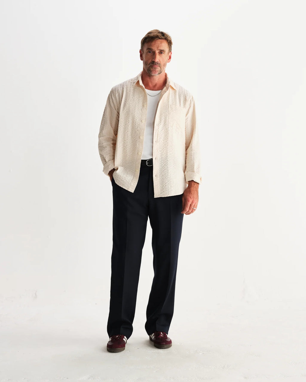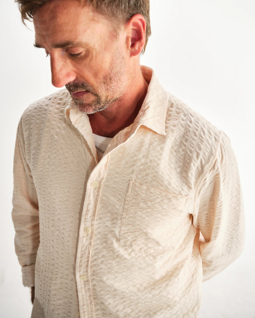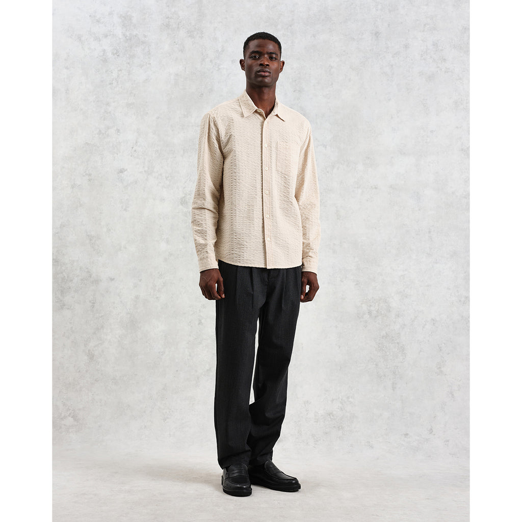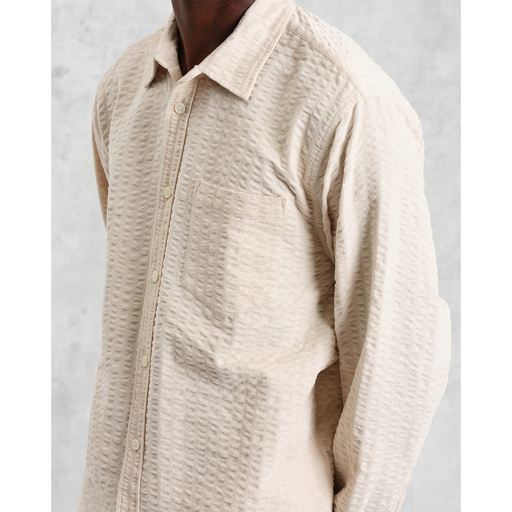 Shelly - Stone Seersucker Corduroy Shirtワックスロンドンの定番のひとつである「シェリーシャツ」。リラックスフィットのカッティングで、柔らかなストーンカラーのシアサッカーコーデュロイ生地を使用しています。独特の風合いがどんなスタイルに深みと個性を添えます。