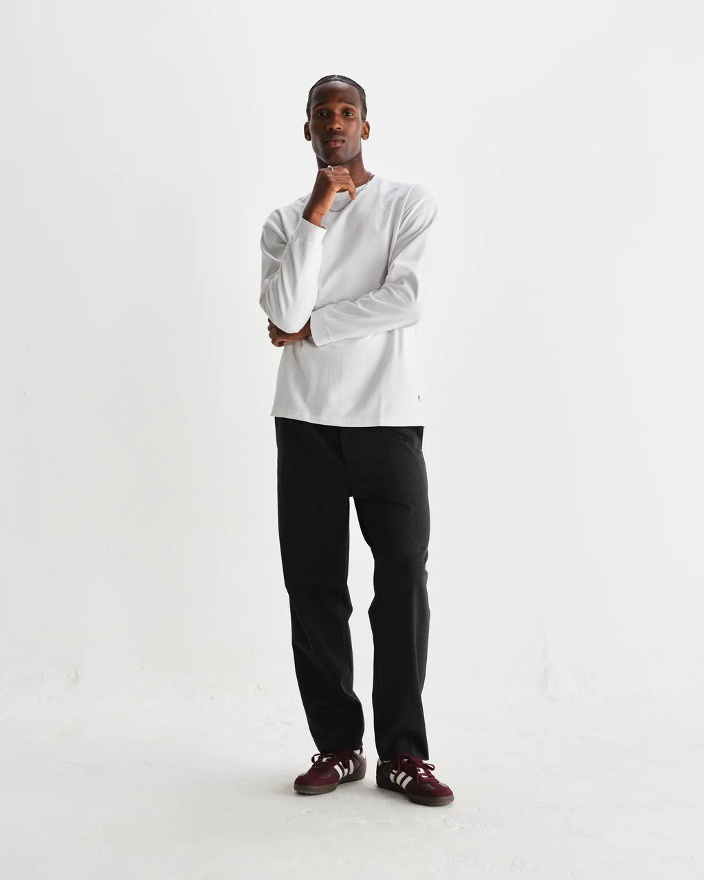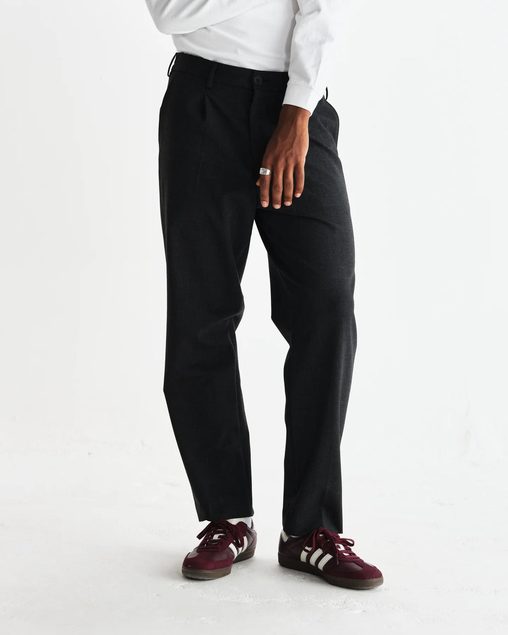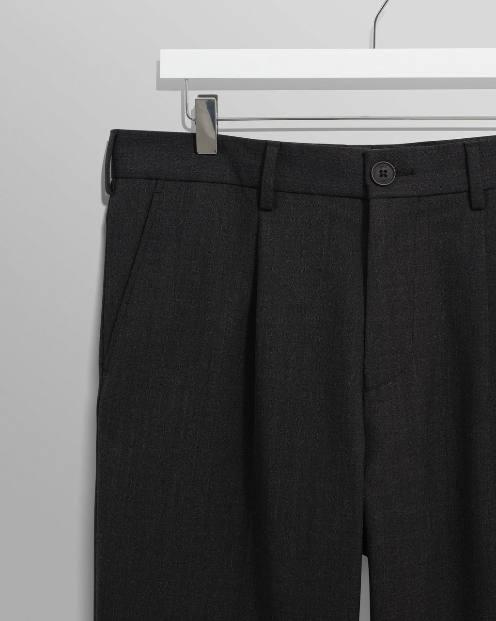 足首に向かってテーパードするゆったりとしたフィット感のシルエットは、スマートなシーンはもちろん、カジュアルなシーンにも着用でき、スタイリングの幅が広がるアイテムです。ウール混紡ツイルを使用し、フロントはシングルプリーツです。
